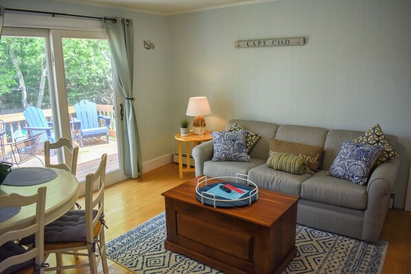 Charming three bedroom home, only 2 miles to Jackknife Beach in Chatham. Decorated in tasteful beach decor, this home offers both a living room and den, both with TV’s (streaming services only). Slider doors from the den open to a deck with outdoor seating and gas grill. There is a spacious lawn with fire pit, perfect for toasting marshmallows during the warm summer nights. This home boasts three bedrooms, each equipped with window air conditioning and a full bathroom located in the hallway. Amenities include Wi-Fi, washer/dryer, and enclosed outside shower.