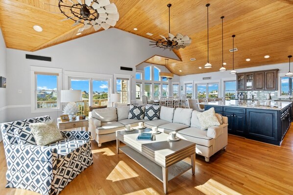 Paying homage to Hatteras Island’s famous lighthouse, a replica lights the way as you amble up the stairs to the third level, an elegant, open, and airy enclave where every thoughtful detail leaves an indelible impression. The large and superbly equipped kitchen will instantly become a focal gathering point. Plan your day over coffee at the large and luxurious quartz island, collaborate over meal prep with dual appliances, and gather for memorable meals at the 12-seat dining room table with four extra seats at the island. Stylish and comfortable seating in the great room brings everyone together, too, for conversation or communal TV time. Relax and enjoy the fans whirling overhead from the wood-lined pitched ceiling or catch a cooling breeze on the home’s wrap around deck where both unobstructed ocean and sound views invite you to unwind and take it all in. Sunsets from the rear deck are epic as you watch the sun descend into the Pamlico Sound. The final king ensuite bedroom on this level features an expansive bathroom with stereo sound and a private balcony.
