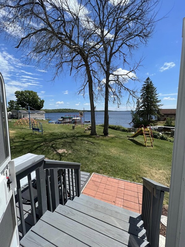 Flexible check-in/out days with long, extended and short stays welcome (2 night minimum) for our Lakeside 5th Wheel. Our fully furnished lakeside 5th wheel features a Kitchen, dining table, sofa sleeper with new memory foam mattress, King size Master, lakeside deck, heat, air conditioning, cable television and free Wi-Fi. Book a vacation that fits your schedule! With only a two night minimum required, you can check-in on any day of the week. We also have kayaks available for rent for those beautiful fall days ahead to get out on the Lake and enjoy the fall colors!! Swim platform and beach are steps away from the camper!!