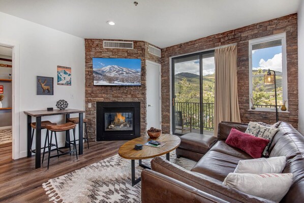 Step into the modern and inviting living room, where comfort meets style. The space is designed with a keen eye for detail, featuring a plush leather sofa that beckons you to sink in and unwind. The 55" Smart TV is perfectly positioned for viewing from every angle, offering endless entertainment options from streaming your favorite movies to catching up on the latest series. As the evening chill sets in, the cozy gas fireplace provides a warm and inviting ambiance, making it the perfect spot to relax with a cup of hot cocoa or a glass of wine. The dining area is thoughtfully arranged, with a table seating 3 and additional bar seating for 3 more, ensuring that everyone has a place to gather for meals or games.