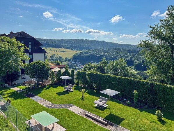 PANORAMA Hotel Heimbuchenthal offers a peaceful escape in town. Book hot stone massages and body scrubs at the spa or relax by the indoor pool with its lazy river and sun loungers. Families enjoy the playground, garden, and terrace spaces that bring everyone together.
