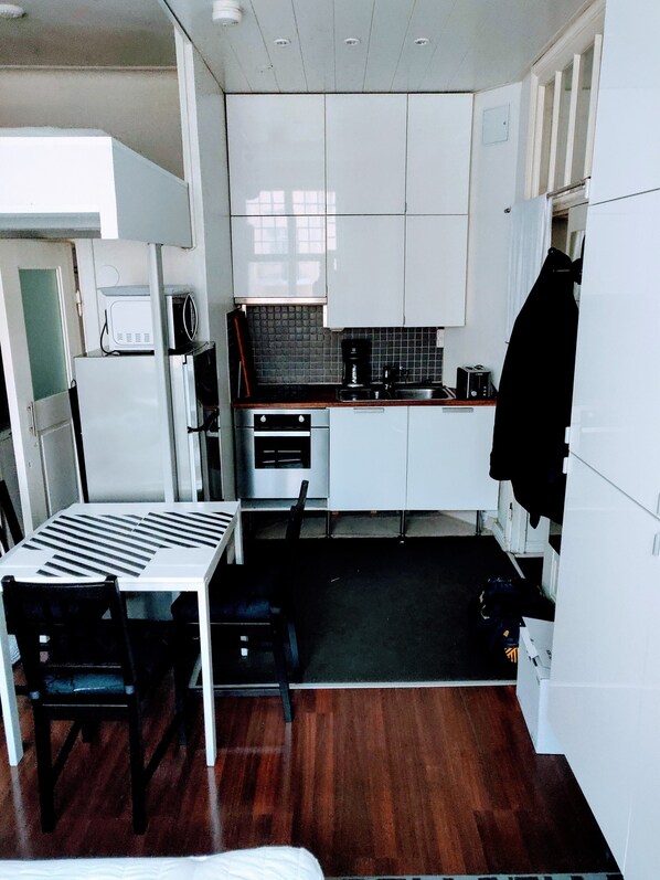 Nestled in a beautiful building from 1900, this charming city center studio boasts an inneryard view and high ceilings. Relax by the fireplace, work at the table, or enjoy meals with friends and family. With a fully-equipped kitchen, modern bathroom amenities like a washer and hair dryer ensure your comfort.