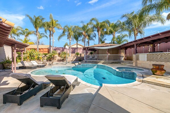 Welcome to your spacious SoCal escape! This 5-bedroom, 2.5-bath retreat comfortably sleeps 13 guests and is designed with families and groups in mind. Inside, enjoy a cozy living room with vaulted ceilings, a fully equipped kitchen, fast WiFi, and a dedicated workspace—ideal for remote work or extended stays. Outside, the fun continues in your private backyard oasis with a pool, hot tub, BBQ grill, firepit, outdoor TV, and multiple shaded lounge areas.