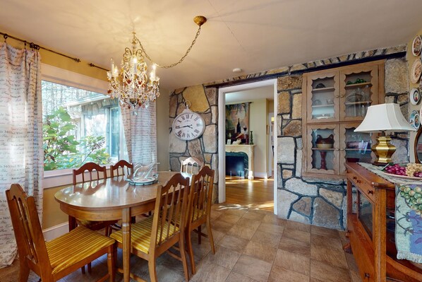 Unwind in the inviting living area with a plush sofa and a TV. Antique accents, classic photographs, and a grandfather clock enhance the pleasant setting. Select a book from the library and find quiet privacy in the reading room furnished with an armchair. The kitchen features an endearing retro style. Ample cookware makes it easy to create your favorite recipes.