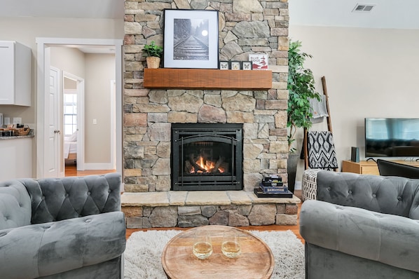 The open main floor boasts a large kitchen with all the amenities you’ll need for your stay, plenty of seating along the island or at the dining table, a cozy lounge area in front of the fireplace and ample seating in the living room for watching movies and relaxing.