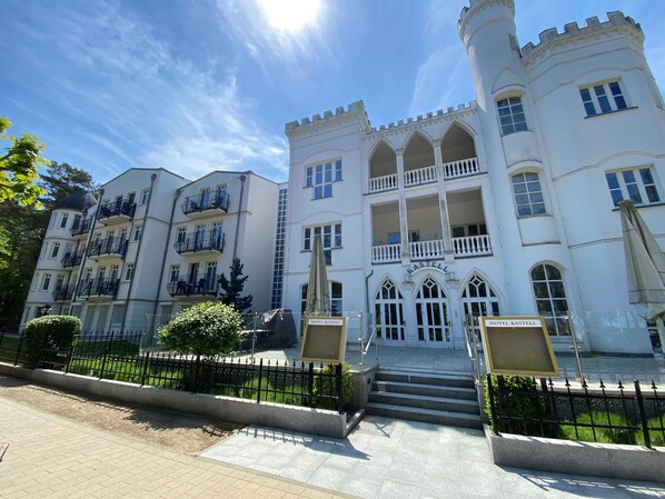 The cottage Kastell is located directly on Ahlbeck beach, on the promenade. There is a hotel complex Garni with spa and a modern wing, which houses the holiday apartments. In the house there is an underground parking space for your car included. An elevator takes guests comfortably to their holiday apartments. Guests may take advantage of the hotel's breakfast menu (fees may apply) and use of the WLAN for a fee