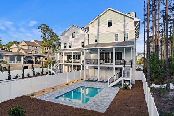 The outdoor area is your own resort-style paradise. Dive into the crystal-clear, private pool in a fenced yard for a refreshing escape, then gather for a delightful dinner on the spacious back porch with a propane barbeque grill. Sunbathe in style on one of six luxurious loungers, or head to the fourth-floor deck for breathtaking, panoramic ocean views—the ideal spot to sip sunset cocktails and unwind in ultimate tranquility.