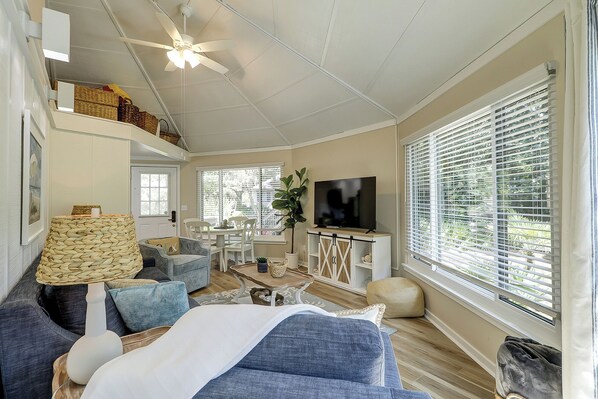 Our cottage has had a complete renovation with a focus on fun and comfort. The Night Herons are unique, nine-sided structures that sit in the middle of nature in Hilton Head's exclusive Sea Pines Plantation. Our piece of Heaven includes a living room with ample space and a fully stocked kitchen. The bedroom features a king size bed and full bathroom with shower. Beach Towels & Beach Chairs are included in every Hilton Head Rentals professionally managed property.