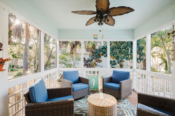 Upon entering 26 Mallard you will find a large open living space including the living room, dining area, and kitchen. The living room features plenty of seating and a large flat-screen TV. Just beyond the living room is the dining area with seating for 8. The space is equipped with a work desk should you need to get some work done on vacation. The screened porch is off to the left and is an ideal spot for an afternoon read. The renovated kitchen is fully stocked for all your cooking needs. There is also a brand-new, reverse osmosis water system in the kitchen. Also in the kitchen the homes stacked washer and dryer with a sink.