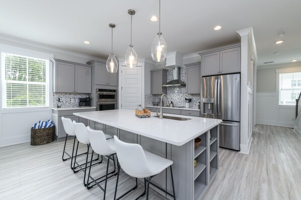 First Floor: Features a gourmet kitchen with upgraded stainless-steel appliances, including a convection oven. Quartz countertops throughout and an island with seating for four. The kitchen is fully equipped with all the cooking utensils you need and a starter set of paper towels, trash bags, and dishwasher tablets. The living and dining room are an open floor plan featuring sliding glass doors that open to the first-floor screened porch with a cozy swing bed and additional seating for two. There is also a king bedroom with a large flat screen smart TV and a full bath with tile walk-in shower.