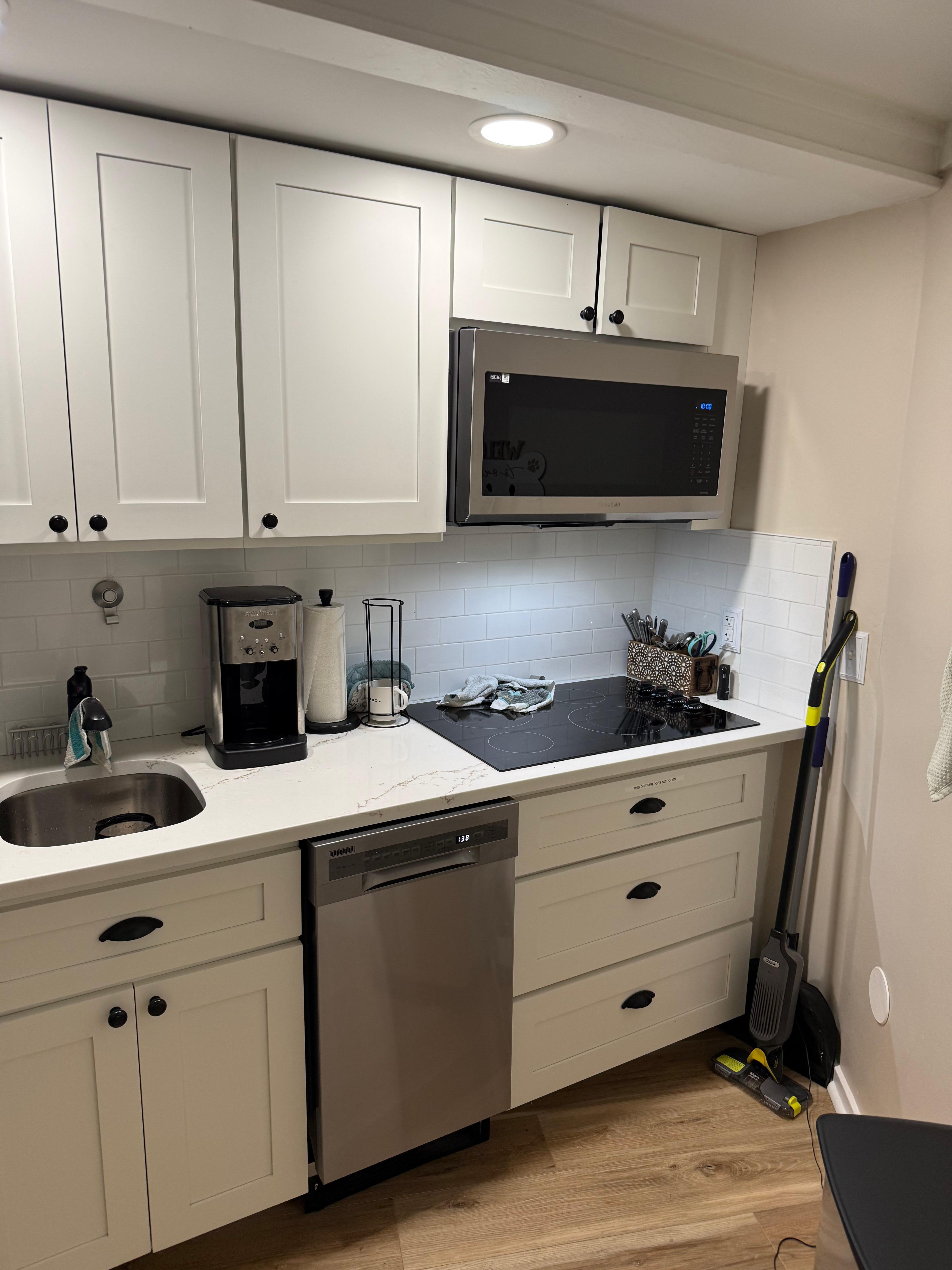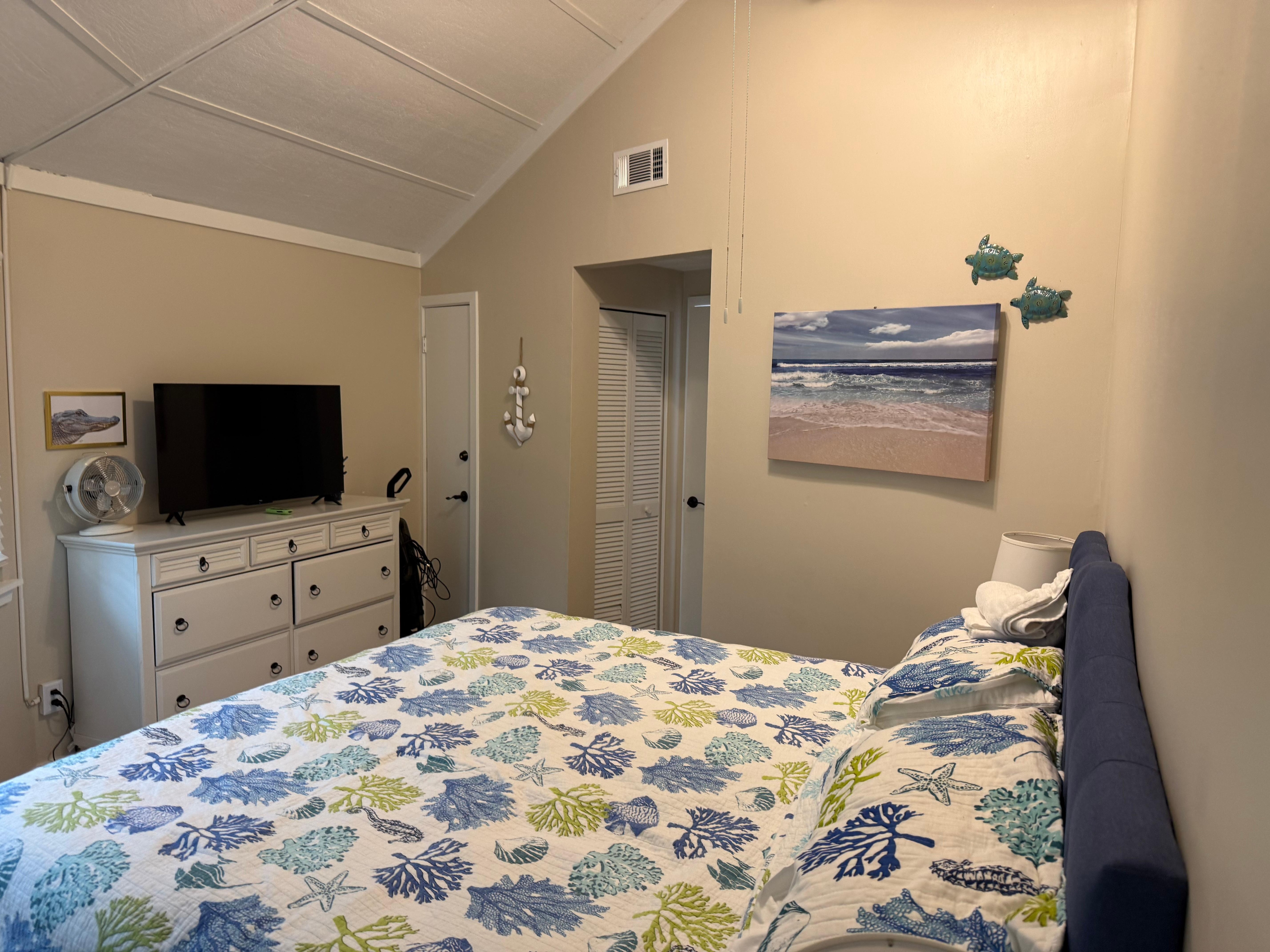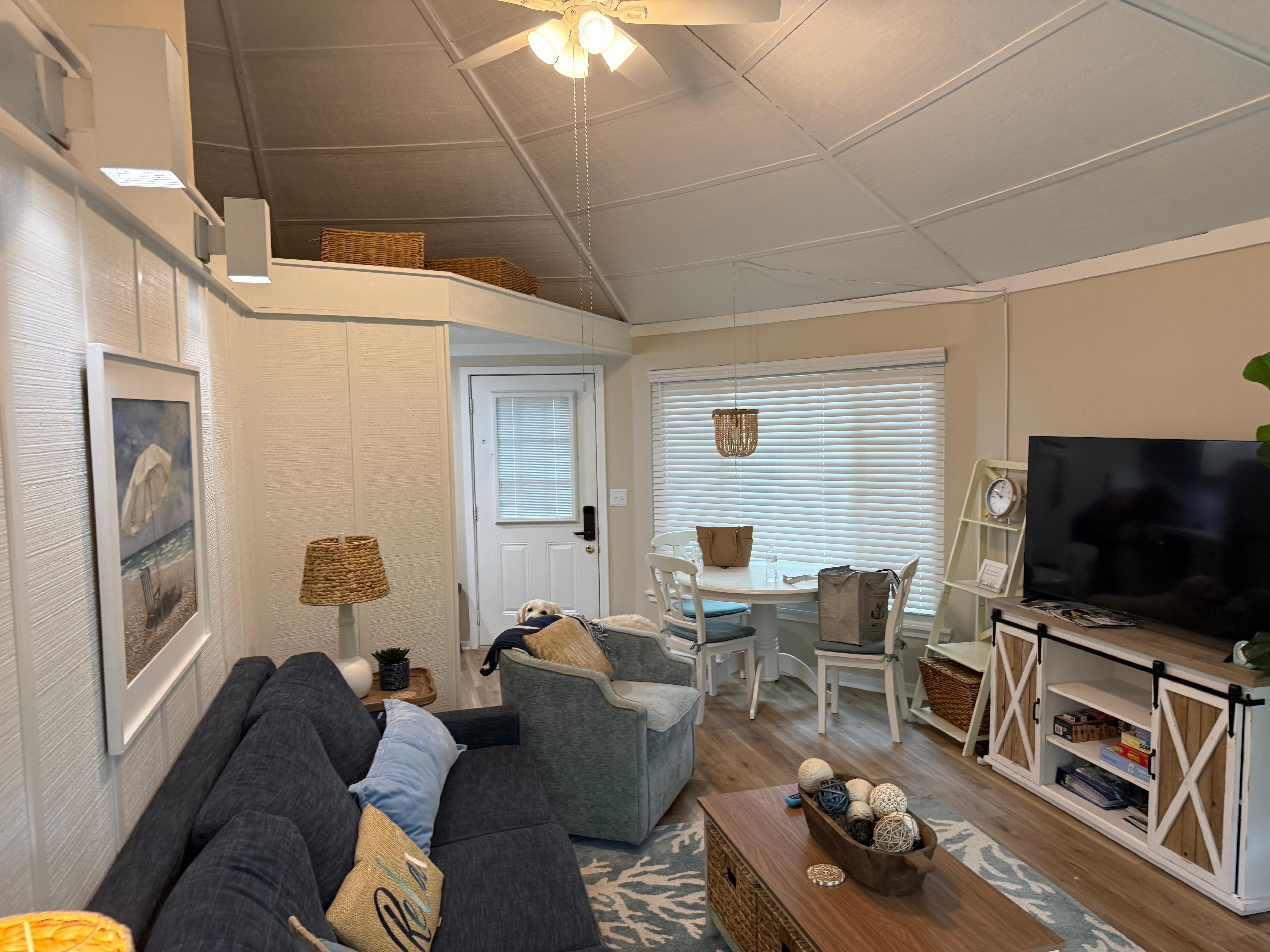The living area opens onto a sun-kissed deck where you can sip morning coffee or unwind after a day by the ocean. Inside, you’ll find a fully equipped kitchen, cozy seating, free Wi-Fi, and cable TV, with thoughtful touches like keyless entry, in-unit washer and dryer, and starter supplies of soaps and paper goods. The spacious bedroom includes a king-sized bed and adjoining full bath with shower, while a pull-out option allows the cottage to comfortably accommodate up to four guests.