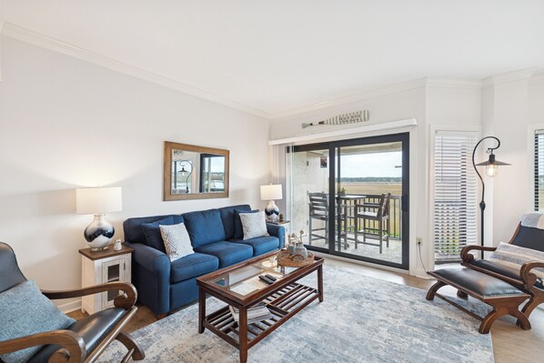 At 202 Captains Quarters, unwind in the tastefully decorated living room with a good book or gather around the flat-screen TV. The open-air balcony offers beautiful sights and sounds of nearby Broad Creek, while the fully equipped kitchen lets you enjoy home-cooked meals.