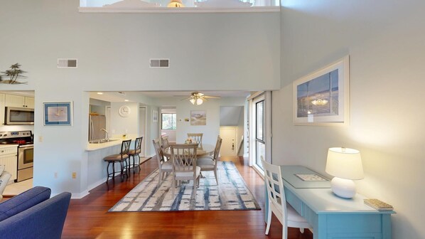 This wonderful two-story Hilton Head vacation rental has been freshly painted throughout and features a recently updated first-floor bathroom with a new tiled walk-in shower. It’s conveniently located just a short bike ride to the beach and offers easy access to all the amenities the resort has to offer. The living room comes with a HDTV and provides access to a private deck that overlooks the community pool and pavilion. The fully equipped kitchen makes meal prep a breeze, and the dining room offers seating for six.