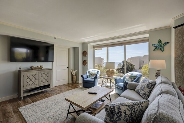 The Living Area has new furniture, and the new 65-inch Smart TV to watch all the streaming channels. It opens onto a balcony which has new bar-height furniture carefully chosen to enhance the enjoyment of the courtyard, ocean and sunset views. The Dining Area seats six.