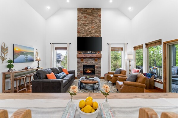 Families gather around the fire pit making s'mores or soak in the hot tub after a day of adventure, with Table Rock Lake's recreational opportunities nearby