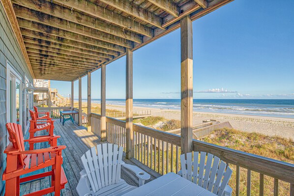 Oceanfront home with beach access, ocean and beach views, foosball table, deck
