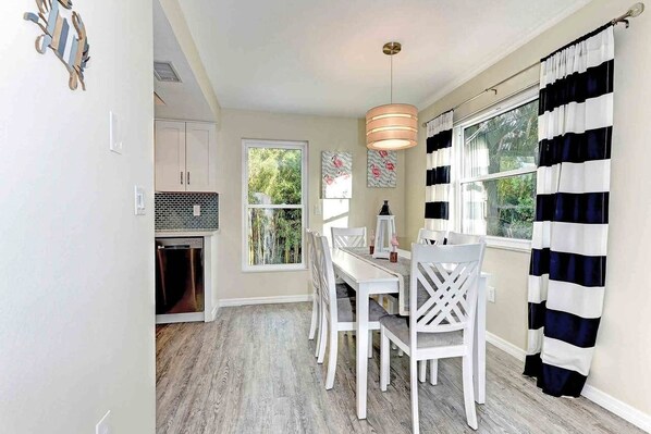 The kitchen offers stainless steel appliances including a dishwasher. You’ll love the beautiful countertops and tile back splash. The dining room comfortable accommodates all six guests. You’ll find all the most updated features during your stay.
