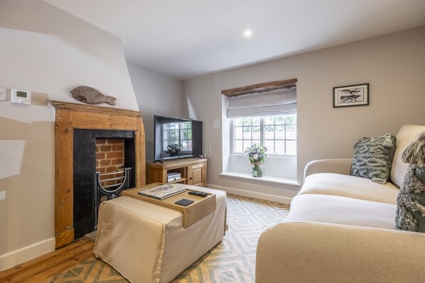 Experience the charm of 12 Station Road, a lovingly renovated Grade II listed cottage in Holt. Enter through the backdoor and be welcomed by exposed stonework, beams, and a well-equipped kitchen perfect for cooking local produce. The inviting coastal-inspired dining room features an ornamental fireplace, while upstairs awaits a light-filled sitting room with Smart TV.