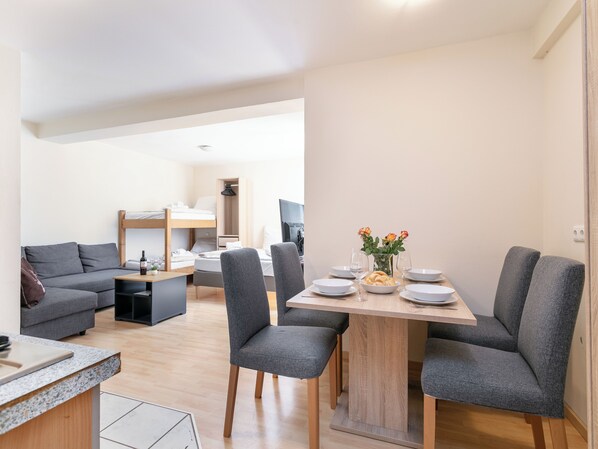 The location could not be more central: four minutes on foot to the valley station of the Hopfgarten cable car which means close to the immediate skiing fun and hiking adventures. The comfortably furnished apartment offers enough space for up to four people. It has a small open kitchen, which is integrated into the living-bedroom, and a bathroom with shower and WC. In the spirit of sustainability, the apartment can be easily reached by bus or train (distance to the station approx. 250m)