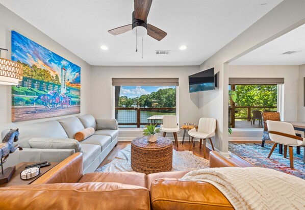 Step into a bright and comfortable living area with large windows that bring in natural light and offer a glimpse of the trees and water just outside. A stone fireplace adds a warm, cozy feel, and there’s plenty of seating for everyone to settle in and relax. It’s a great spot for morning coffee, evening movies, or simply hanging out together between activities. Just off this space, the den gives you an extra place to spread out, with two oversized couches, a TV, and game tables for foosball and air hockey—perfect for keeping everyone entertained, rain or shine.