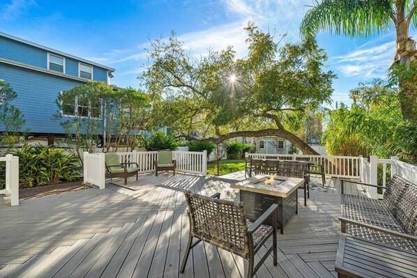 Boardwalk Bungalow, located just steps from the Kemah Boardwalk in Texas, offers a charming retreat. Relax on the sun-dappled deck surrounded by lush greenery and enjoy amenities like a charcoal grill, fire pit and spacious outdoor lounging area with tons of seating.