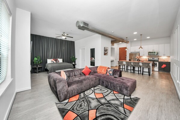 1 bedroom, iron/ironing board, WiFi, bed sheets - Luxury Midtown Studio w/ 75” Smart TV, Weekly Cleanings – No Cleaning Fee! (Houston)