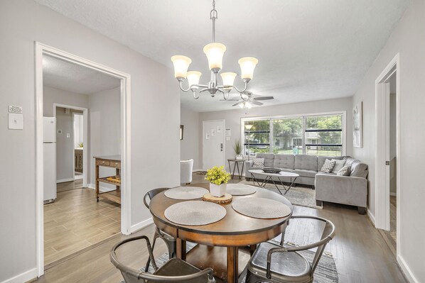 • Parking: Ample parking available with free parking on premises (driveway) and free street parking. • No Pets: This is a No Pet property (Service animals only). • Workspace Note: There is no dedicated workspace (desk/chair) provided, but the dining tables offer ample space for remote work. ___________________________________________________________________________