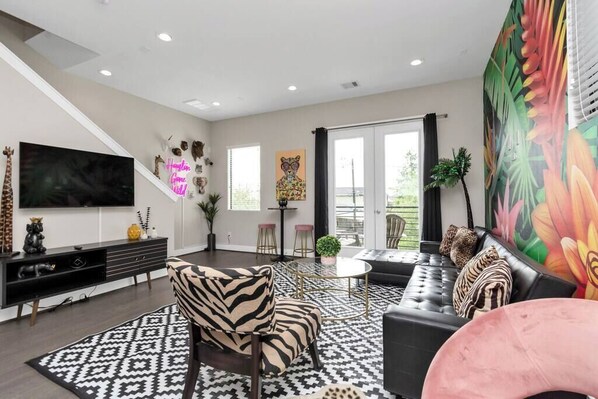 Escape to The Neon Jungle, a luxurious 3-story Houston home nestled in the heart of East Downtown. Unwind on the balcony with outdoor furniture, immerse yourself in art and decor featuring a neon sign, or relax by watching your favorite TV show on the smart 58in TV. With fully-equipped kitchen amenities like modern appliances and spacious countertops, you'll feel at home.
