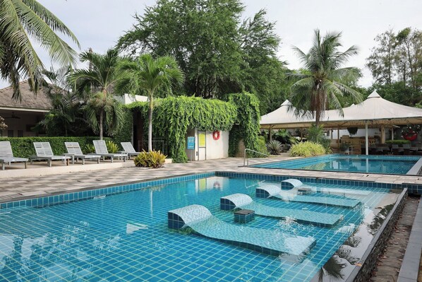 Sanae Beach Hua Hin offers beachfront dining and professional spa services. Guests enjoy a poolside bar, on-site store, sun loungers by the outdoor pool, and a dedicated pool for children.