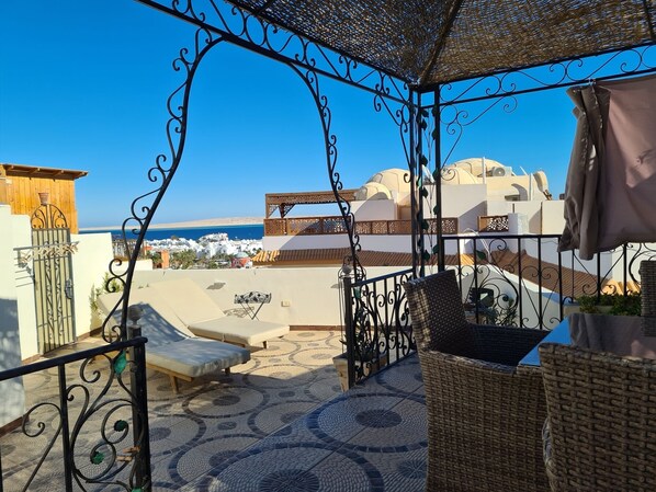 - own roof terrace only for tenants of this apartment and their friends: fantastic sea view, 2 large sun loungers, large pergola for shade, sitting area, lighting for the evening, barbecue shower and clothes dryer