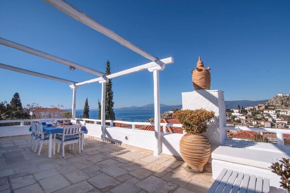 Outdoors, the 85m² terraces invite you to enjoy fantastic panoramic views of the city and the port of Hydra, the sea, the mountains of the Peloponnese and the neighbouring islands.