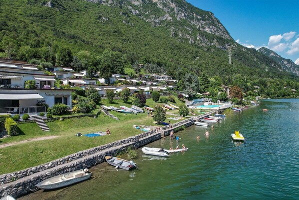 This apartment is located on a beautiful bungalow park directly on the western shore of Lago Idro. The bungalow park, under Dutch management, is perfect for the whole family. The park has modern apartments for 4-6 people, a comfortable and excellent restaurant, a pizzeria, a mini market, tennis and table tennis (not covered). The park offers guests the large swimming pool (20x10m). From the pool you have a wonderful view over the mountains and the lake. The Idro Lake is very popular primarily by nature lovers: through its crystal clear waters, the dense vegetation, the ancient mountain villages and the beautiful surroundings, which still remains pretty intact. This area is the ideal destination for those who long for peace and also for those who want to visit good and popular tourist areas. From mid-June to mid-September is on the bungalow park a surf school, where surfboards can be rented.