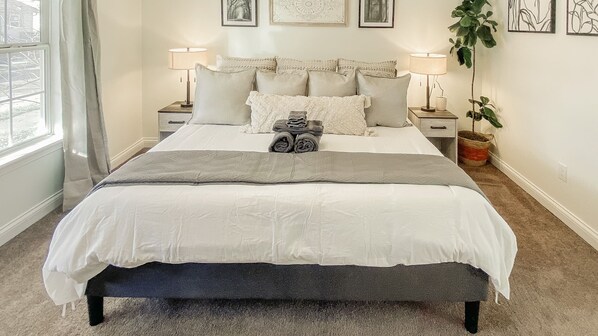 KING BEDROOM: Right off the living room, you'll find the largest bedroom in the house with a King Bed that features a Nectar mattress. There is a large desk and plenty of space to put suitcases, etc.