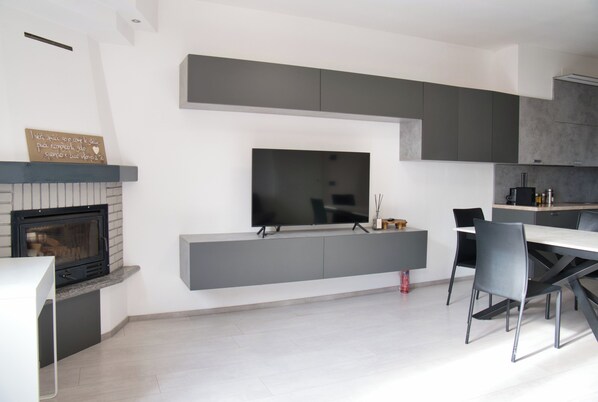 Upon entering, there is access to a large open space area that includes a living area and a sleeping area. The living area features a comfortable sofa in front of the TV, a decorative fireplace and a pleasant dining area with a well-equipped kitchen, equipped with gas stove, oven, dishwasher, microwave and coffee maker. From here you can access a beautiful panoramic terrace, with an open view of the valley, furnished with a table for outdoor dining and comfortable chairs to relax and enjoy the view.