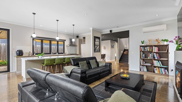 The townhouse features an entertainer’s kitchen, fully equipped with modern appliances and plenty of counter space, making meal preparation a joy. An air fryer and dishwasher means you can spend more time enjoying your holiday and less time cleaning up. The main lounge is cosy and inviting, with plenty of seating for everyone. It features a large selection of books, a flat-screen TV and a warm fireplace. A wall mounted split system ensures comfort throughout the year, no matter the season. For additional space, there’s a second living area upstairs, ideal for quiet moments or as a separate area for kids and teens to relax.