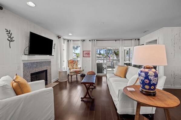 This isn't just a condo, it's your home away from home. It's a really lovely 2 bedroom, 2 bathroom space – and it's on the ground floor, so super easy to get around! Being an end unit means extra peace and quiet, too. Inside, it's all about relaxing. The living area is nice and open, perfect for hanging out. But honestly, you'll probably spend a lot of time on the screened porch! Imagine sipping your morning coffee or enjoying a sunset cocktail while watching the boats go by.