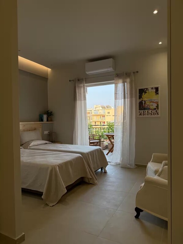 Apartment 30 sq.m. on the third floor with elevator and comfortable balcony with awning. Two single beds that join into a comfortable double. Equipped kitchen and bathroom. Bright and quiet, with WiFi, smart TV and air conditioning. It is located next to the hydrotherapy center of the Greek National Tourism Organization.