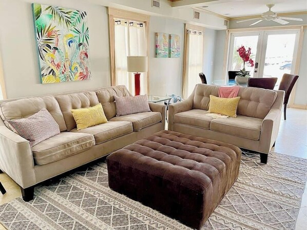 Located a block from the beach, this ocean view apartment in Jax Beach is perfectly positioned near downtown's restaurants, cafes, shopping and nightlife. Relax with luxury linens and Roku TVs or enjoy quality time with family in the fully equipped kitchen.