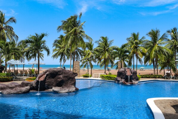 Overlook swaying palms and turquoise waves daily when you call this Jaco condo your vacation destination! While enjoying beaming rays of sunlight, dip into the shared plunge pool. Or, head mere minutes away to one of the area's world-renowned beaches. When you want to engage in a thrill, book a catamaran tour, slide through lush green landscaping on a zipline, or take a crocodile tour.