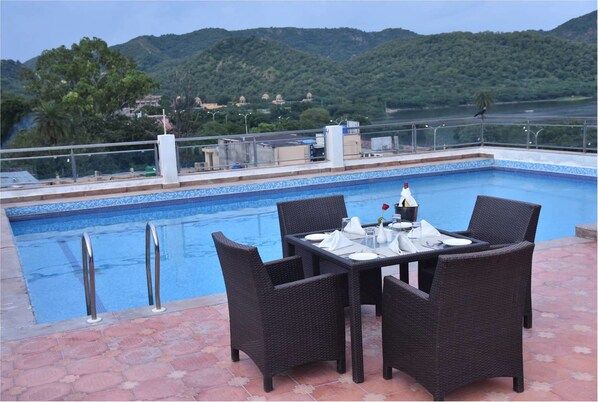 Travelers dine under the stars at the rooftop restaurant before cooling off with a swim in the outdoor pool at this peaceful Jaipur retreat
