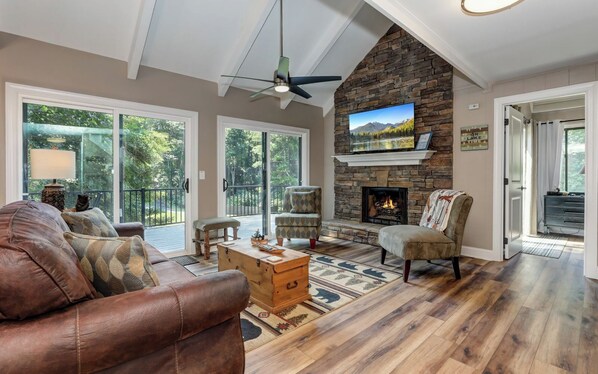 View the championship golf course from your open decks, where you can sip morning coffee or fire up the gas grill and dine at the outdoor table. On cool evenings, light a fire in the stone (gas) fireplace to pair with wine, dessert, a good book, or a DVD film on the big screen TV in the living room. You can set up board games at the table between mealtimes, with snacks and drinks prepared in the fully equipped kitchen at your Big Canoe rental.