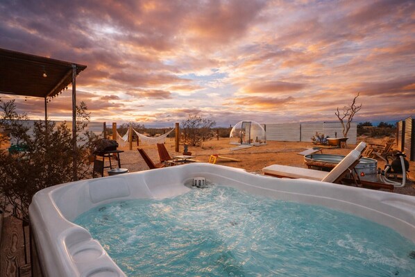 Guests have full, private access to the home and the main fenced portion of the property, where the hot tub, cowboy pool, dome, and outdoor amenities are located. You’re also welcome to explore the remaining acreage beyond the fence, understanding that it’s natural, undeveloped desert land.