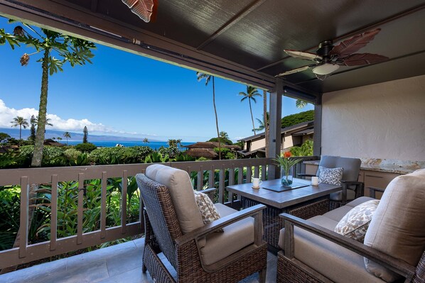 Terrace/patio - 3BR Ka’anapali Retreat | Ocean Views, Gorgeous renovation, Walk to Beach (Lahaina)