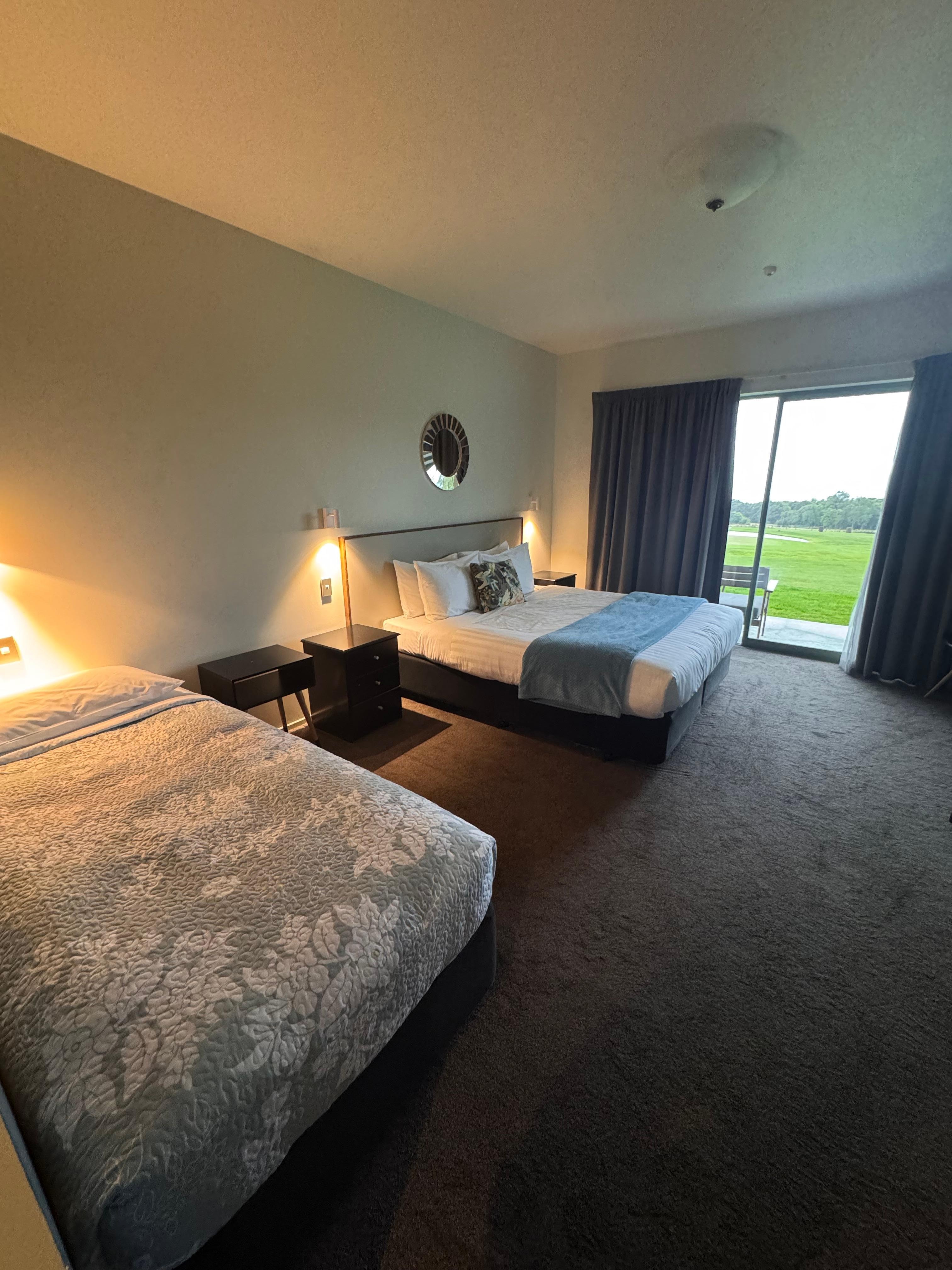 Absolutely beautiful spot with stunning views. Very spacious. Disappointing there was no comfortable lounge chair to sit by the window to appreciate the view or have bed on the other side of the room so you could see the veiw from the bed. Bed extremely comfortable and so nice & quiet there. A bigger counter for tea/coffee making be a good idea and brighter light (with dimmer) be helpful. Staff left earlier than advertised reception hours so couldn’t ask questions. Owners could do so much more to make the most of stunning location & wonderful size of the rooms-be happy to give free interior design idea if interested. Of course the golf course the big draw card and the course did look extremely well maintained. Hope to return