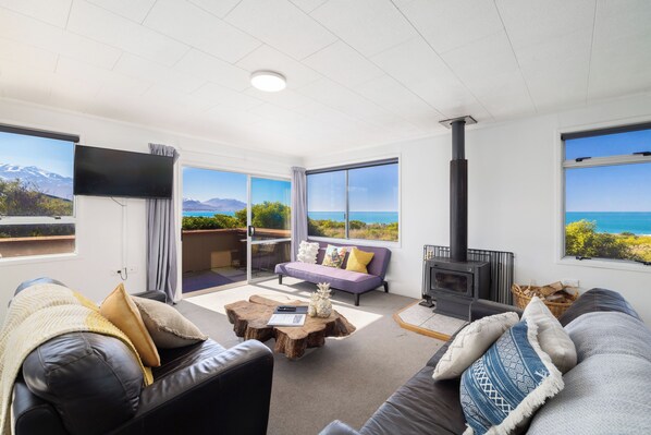 Perched next to the beach with private access, this Kaikōura home offers a haven for relaxation. Enjoy Mountain and Beach views, multiple living spaces including a games room with pool table and darts, 50 inch smart TV + Netflix/Youtube/Freeview. A well-equipped kitchen lets you cook up a storm while log fires keep things cozy.