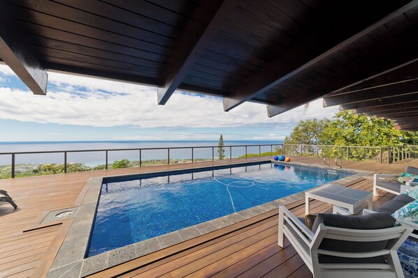 E Koma Mai (Welcome) to this upscale retreat that offers you a true luxury experience. Sitting on a hillside, this home boasts unobstructed views of the coastline from the main pool deck, the upper lanai, and from nearly all interior spaces. With 3 bedrooms and space for 6 guests, this home is perfectly set up to accommodate 3 couples or families, as there is plenty of private space. With a prime location just 10 minutes from the beaches, this home will provide an unforgettable Big Island adventure.