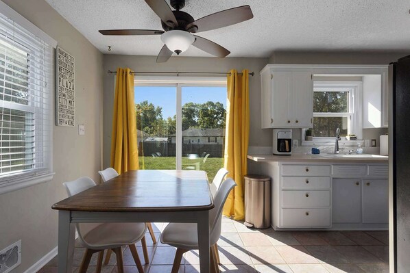 This 4 bedroom (all KING BEDS!!!) and 1.5 bath home has beautiful natural light and it is the perfect get away to relax, have a cup of coffee in the lounge, or just read a book during the daylight. This is a central location walking distance from all restaurants and shops. Easy highway access- only 20mins away from downtown Kansas City. Located in a quiet neighborhood with a large fenced back yard, fire pit and grill.