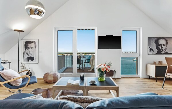 The loft-style holiday apartment is bright and friendly and radiates cosiness. It's easy to feel at home here! The integrated kitchenette in the living/dining area is fully equipped and invites you to cook together. In the living area, the comfortable sofa invites you to linger and a TV provides a change from the harbour cinema.