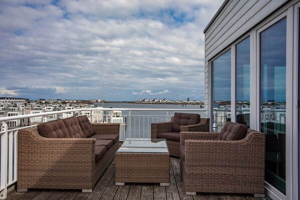 Exclusive semi-detached house on 3 levels, in a unique location on the western pier of the Baltic Sea resort between the Schlei and the harbour, with 127 sqm living space, terrace and roof terrace, fireplace, sauna, bathtub with whirlpool function - and with a fascinating view over the harbour and the Schlei!