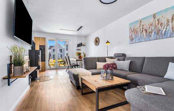 Welcome to beach life! Leave everyday life behind you and enjoy your well-deserved holiday in this dreamlike holiday apartment in the immediate vicinity of Weidefeld beach and the harbour promenade in Olpenitz. Step into the spacious and open-plan living/dining area, which immediately invites you to relax with its cosy ambience. You can relax on the cosy sofa in front of the Smart TV. The seating area can easily be converted into a large sofa bed.